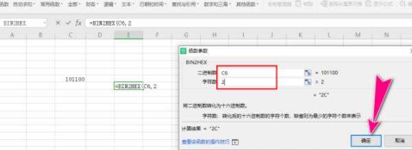 5、之后,在"函数参数"对话框中,"二进制数"文本框中填写二进制数字所在单元格的名称,字符数自定义填写,其为转换的十六进制个数,再点击"确定"按钮。