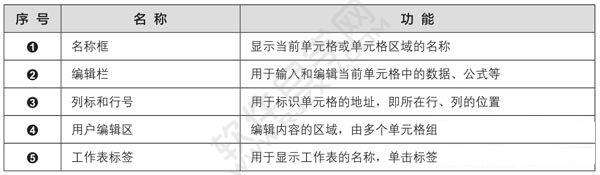 除了和Word 2019的工作界面拥有相同的标题栏、功能区、快速访问工具栏等元素以外,Excel 2019还有自己的特点。Excel 2019工作界面独有元素的名称及功能如下图和下表所示。