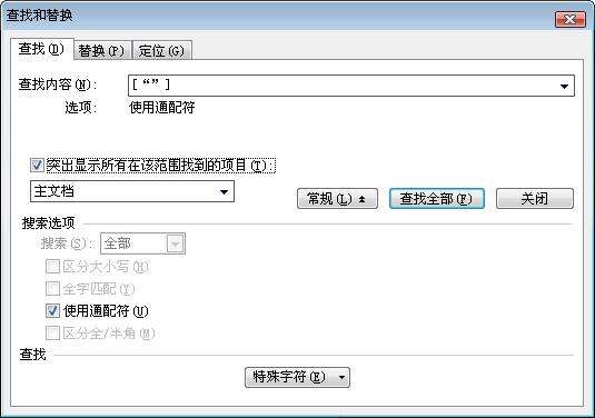 用WPS文字打开要处理的文档,按下“Ctrl+F”键,调出“查找”对话框,在“查找内容”中输入[“”],注意,中括号要在英文状态下输入,而双引号在中文状态下输入,勾选“突出显示所有在该范围找到的项目”,并在“高级”选项中勾选“使用通配符”