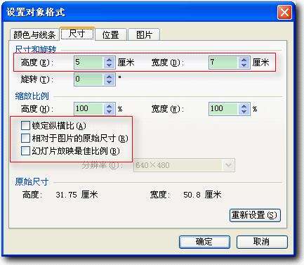 依次单击“插入”—“图片”—“来自文件”命令,打开“插入图片”对话框,按住键盘CTRL键同时鼠标单击,选择需要插入的6张图片,单击“打开”按钮,把6张图片插入编辑区。全选插入6张图片,右击在快捷菜单中选择“设置对象格式”命令,打开“设置对象格式”对话框,单击“尺寸标签”。去掉“锁定纵横比”等三项内容,如图所示,设置高度为5厘米,宽度为7厘米。单击确定按钮完成大小设置。