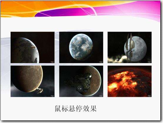 设置好之后就可以实现大小图之间跳转效果,只要鼠标移到那个小图,就会自动跳转到相应的大图,只要鼠标还在大图区域内,就不发生跳转;只要鼠标移到大图区域外,就会自动跳转到第一张幻灯片。鼠标移到另外的小图,则自动跳转到相应的大图……