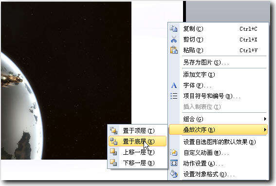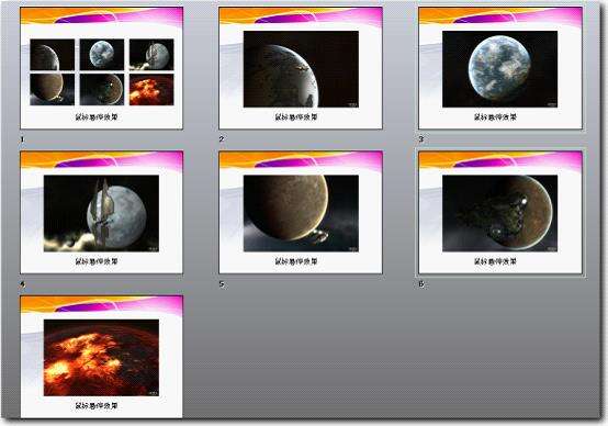 右击此矩形,在快捷菜单中选择“叠放次序”阶连菜单中“置于底层”命令,把这个大矩形放在最下面,那么在上面的图片区域就是这个鼠标移过的无效区域,也就是说当鼠标在2-7张中间的图片上时,动作设置无效,当鼠标移动出图片区域就会产生跳转,跳到第一张幻灯片。