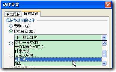 打开“动作设置”窗口,单击“鼠标移过”标签,勾选“超链接到”选项,单击右侧的下拉按钮,在下拉菜单中选择“幻灯片”项,