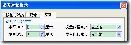 单击位置“位置”标签,设置“幻灯片上的位置”为水平为0厘米,垂直为0厘米。
