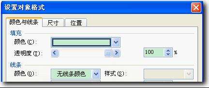 单击“颜色与线条”标签,设线条颜色为无线条颜色,设置颜色透明度为100%,单击确定按钮完成设置。