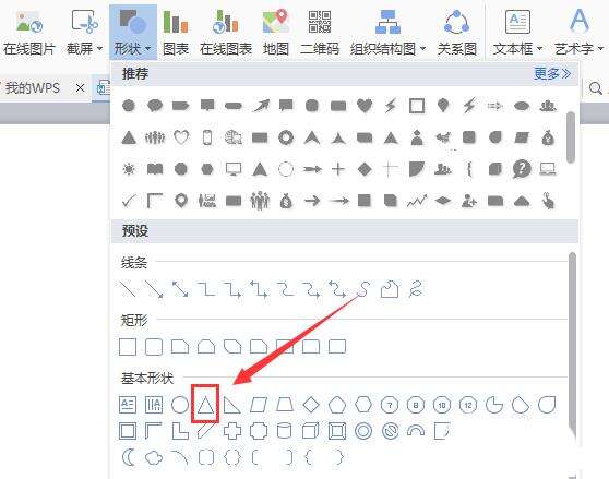 5、在基本形状选项内找到等腰三角形选项,如图所示: