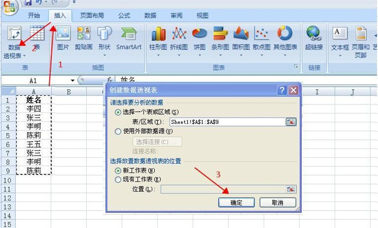 1、点击上方工具栏中的“插入”,点击选择“数据透视表”,在弹出的创建数据透视表床窗口,选择好区域,然后点击确定。
