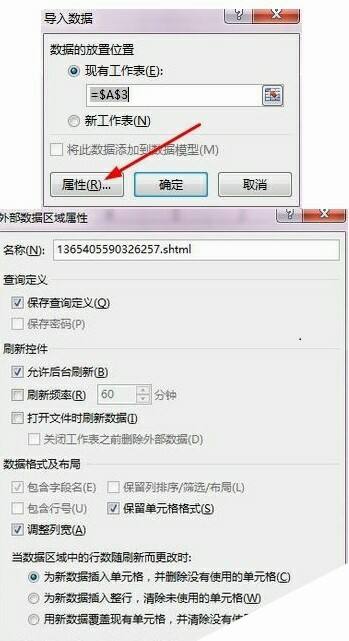 5、你还可以点击属性,对导入进行设置,如图所示,下面第二幅图中,如果你设定刷新频率,你会看到Excel表格中的数据可以根据网页的数据进行更新,是不是很强大。