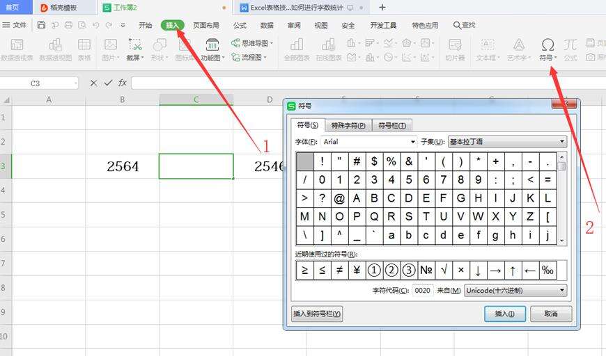 我们打开工具栏【插入】,在下拉菜单中选择【符号】: