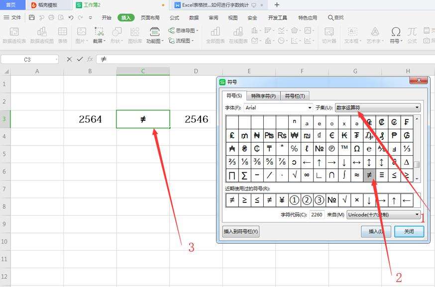 在该符号对话框中,【子集】一栏选择“数字运算符”,在下拉列表中选择“≠”,点击插入,这样在C3单元格中就出现了不等于号: