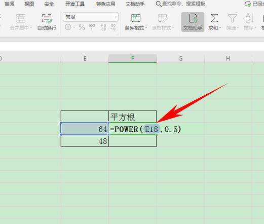 在表格当中输入函数公式=POWER(E18,0.5),POWER函数表示返回给定数字的乘幂。如下图所示: