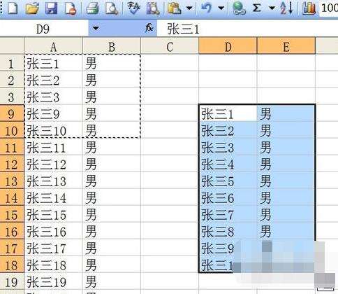 选取要复制的数据区域, 如图,4-8行被隐藏了,选择前4行进行复制,复制到D列第9行,下面可以看,隐藏的数据也显示出来了!