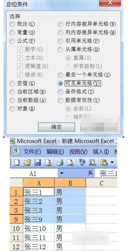 点击“可见 单元格”单选框进行选中;点击“确定”按钮;注意观察单元格现在被选择的状态;
