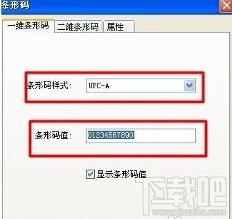 5.选择自己需要的条形码的样式,输入条形码的值,本例以一位条形码。样式为UPC-A。数值为01234567890。