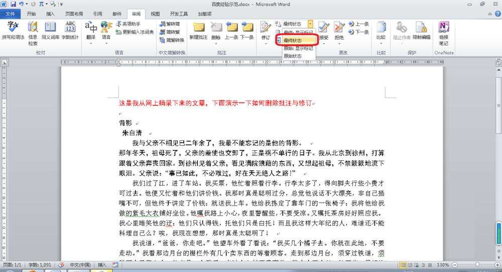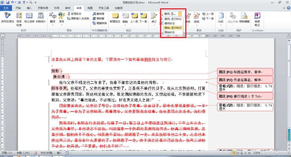该方法只是将批注与修订隐藏起来了,需要时还可使它再显示。下图红框处(审阅/修订),下拉框后有四个选择项,最终:显示标记,最终状态,原始:显示标记,原始状态。