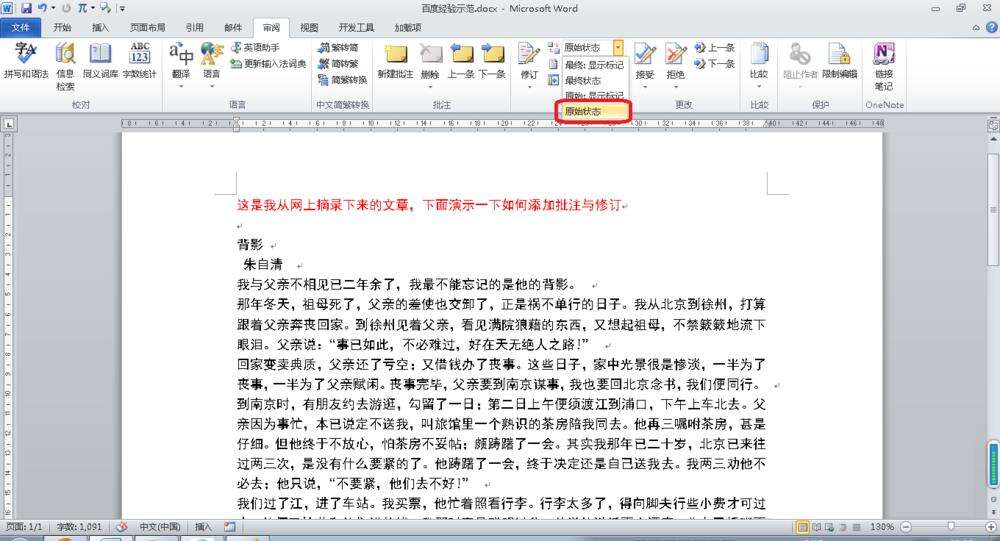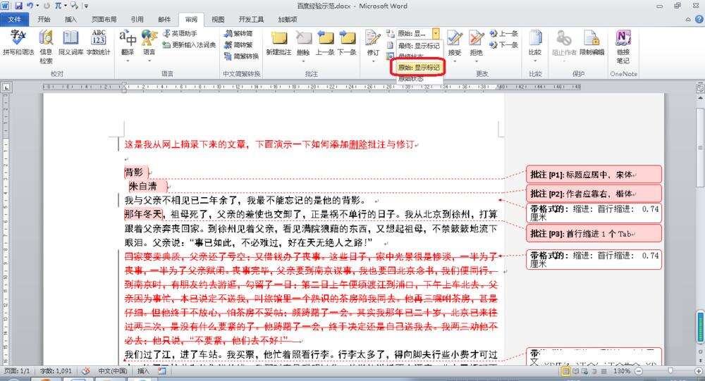 原始:显示标记——某些修改回到初始状态,但显示所有批注与修订;