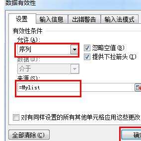 3、在打开的“数据有效性”窗口中,从“允许”下拉列表中选择“序列”,在“来源”输入框中输入名称,例如本例中的“Mylist”。