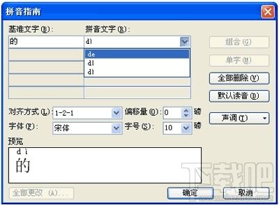 设置了拼音之后,如果需要调整上面的标注,例如图1中的“的”字,标注的时候没有标上音调。选择了“的”之后,再次选择“格式|中文版式|拼音指南”菜单项,打开“拼音指南”对话框,先选择需要更改的韵母,再点击“声调”按钮,选择需要的声调即可。