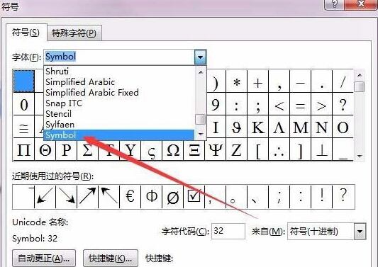 4、在符号窗口中我们点击“字体”下拉菜单,在弹出菜单中选择Symbol菜单项。