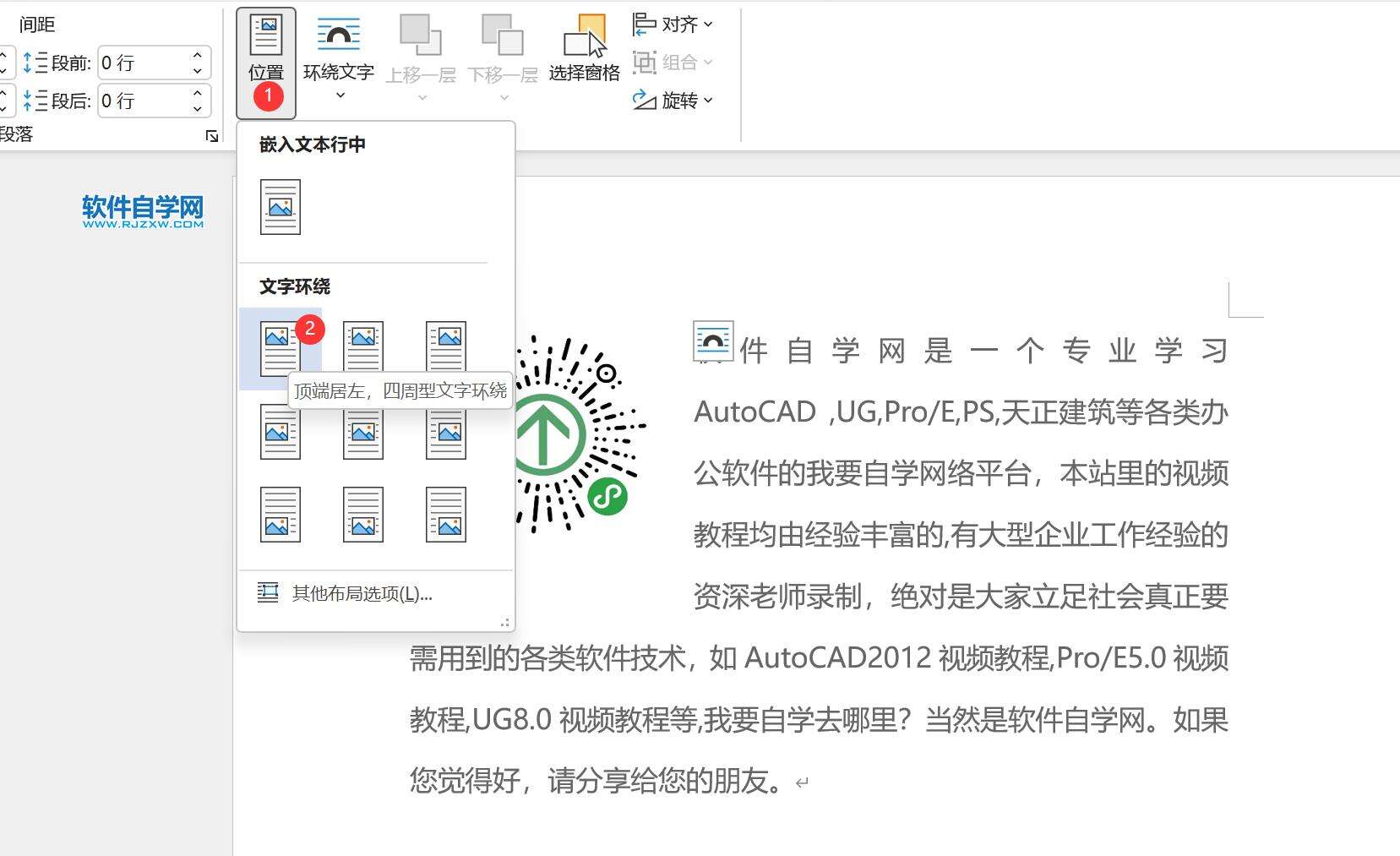 第3步、点击位置,在文字环绕里面,设置顶端居左,四周型文字环绕。