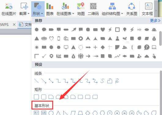 点击形状选项,在其子级菜单里找到基本形状选项,