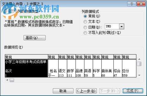 6、在“文本导入向导 – 第3步,共3步”对话框界面中,依旧默认列数据格式,点击“完成”按钮。