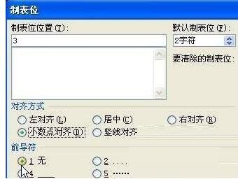 2、在“段落”对话框中,单击“制表位”按钮。在“制表位位置”框中,为新制表位键入适当的度量值。度量值以“字符”为单位,1个字符位可以容纳两个数字,在“对齐方式”标题下,选中“小数点对齐”复选钮;在“前导符”标题下,选中“无”复选钮;单击“确定”按钮。