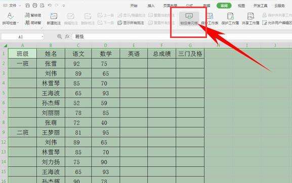 2、接着选中总成绩那一列,点击上方菜单栏中的"锁定单元格",然后点击"保护工作表"功能。