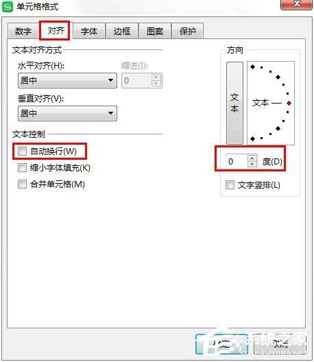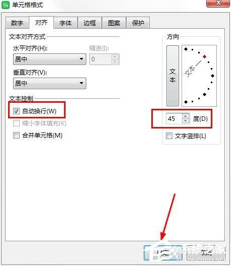 4、在方向的文本下方,输入想要的倾斜角度,如“45”度,或者用鼠标点文本的方向“—”符号,调整角度,不想自己调整文本换行还可以选择自动换行。
