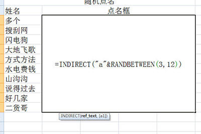 这个RANDBETWEEN(3,12)表示随机抽取3到12,前面合并一个A,表示A3到A12,正好对应姓名栏里所有姓名的的单元格。外面套上一个INDIRECT,就表示,随机抽取A3到A12单元格的内容。