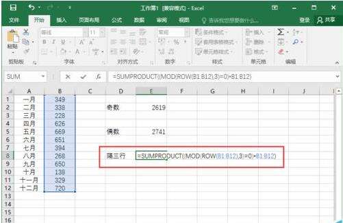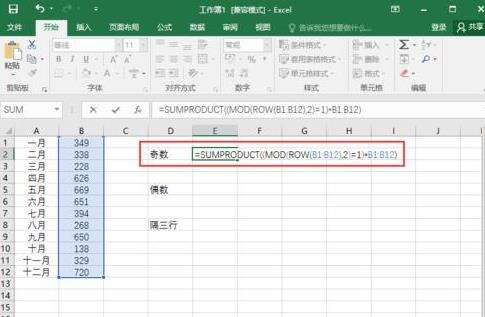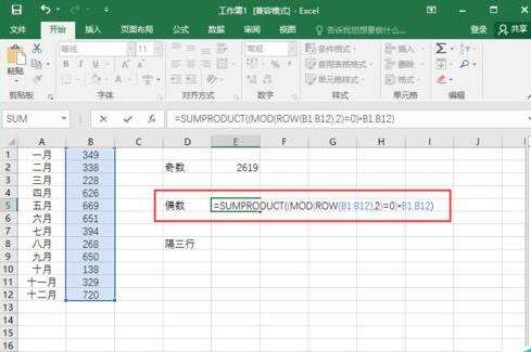 2、在excel工作表的单元格中输入公式:=SUMPRODUCT((MOD(ROW(B1:B12),2)=1)*B1:B12)(隔行求和之奇数月)。