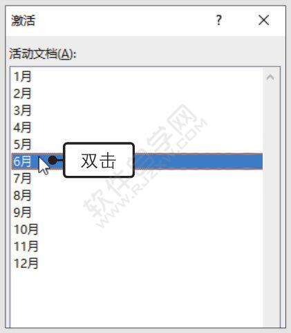 5、定位工作表。打开“激活”对话框,可在对话框中看到该工作簿中的所有工作表,在“活动文档”列表框中双击要定位的工作表标签,如图所示。
