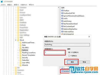 2、找到以下键值:HKEY_CURRENT_USERSOFTWAREMicrosoftOffice16.0WordOptions,在右侧新建DWORD值,取名为NoReReg,并输入数值为1 并确认,关闭注册表编辑器,重新打开Word 即可。