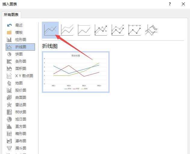 2、选择点击折线图,然后点击选择一种折线图样式。