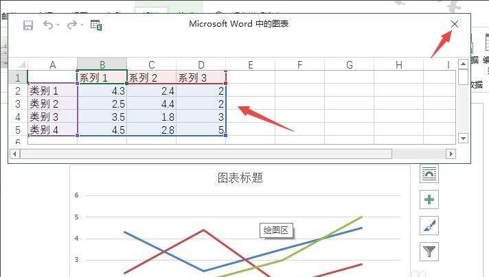 3、然后在弹出的excel中更改相关数据,之后点击关闭,折线图完成。