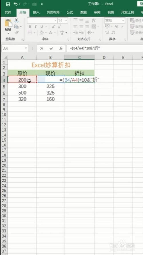 二、然后输入公式=(B4/A4)*10&"折“,然后按一下回车就可以看到折扣了。