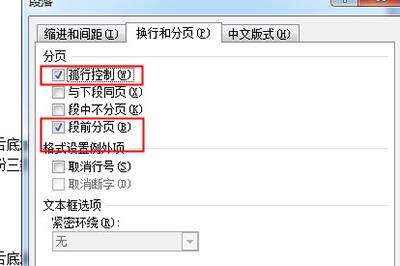 3、在段落窗口中选择【换行和分页】,勾选【段前分页】、【孤行控制】,取消勾选【与下段同页】、【段中不分页】。