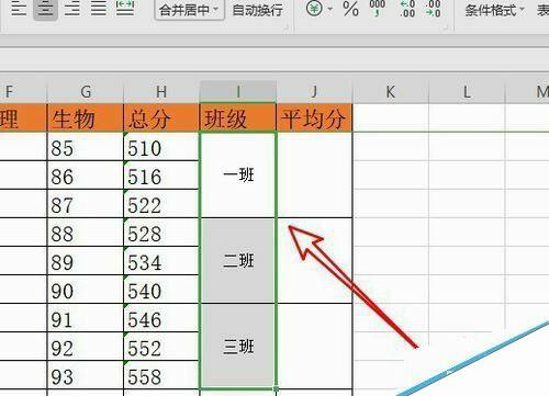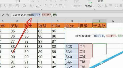 接下来我们在平均分的单元格中输入=AVERAGEIFS(H2:H10,I2:I10,I2)