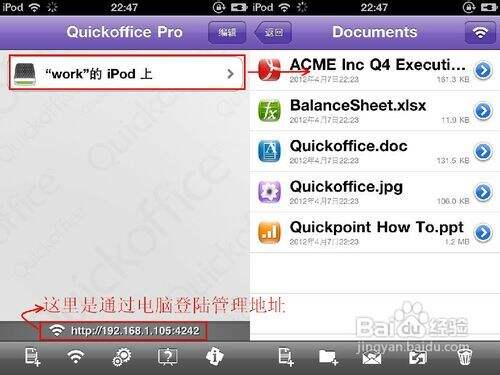 这里演示一下如何把文档放到iphone上,首先打开浏览器。输入上图电脑登陆的管理地址