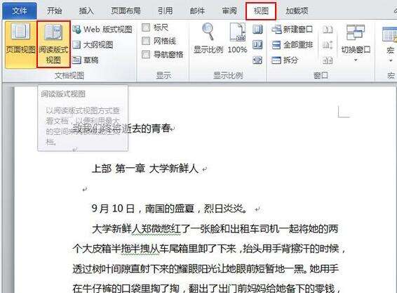 ①打开word2010,将文章复制进去,点击视图–阅读版式视图按钮。
