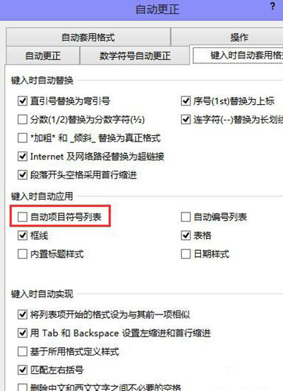 然后我们进入【自动更正】找到【自动项目符号列表】去掉前面的勾,点下面的【确定】。