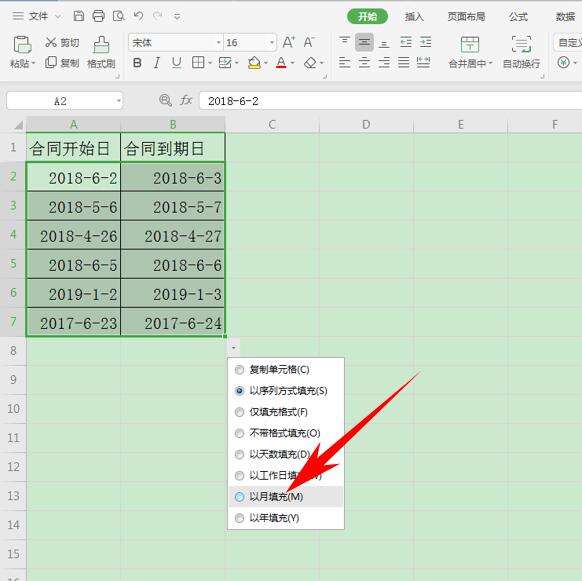 然后向右填充,单击右下角的小箭头,在下拉菜单当中选择以月填充。
