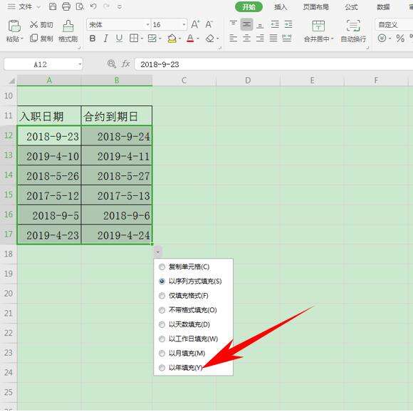 如果合约到期日为一年,我们可以向右填充数据,在下拉菜单下选择以年填充。