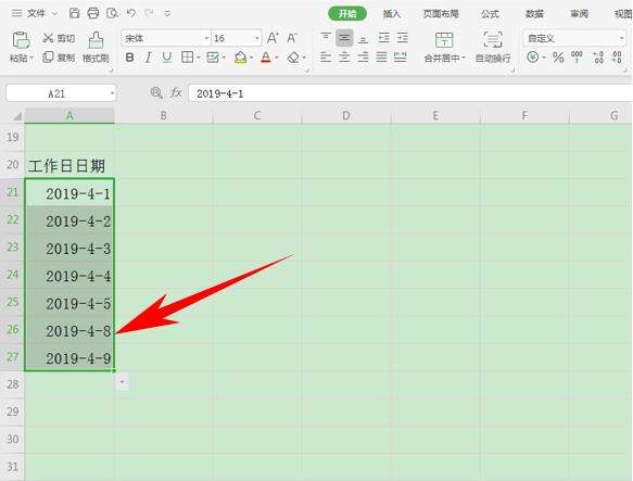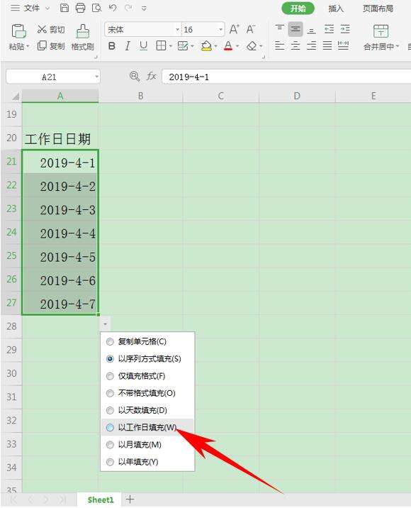 当我们想要批量输入该月份的工作日时,先输入一个2019-4-1,然后下拉填充框,单击右下角的倒三角,选择以工作日填充。
