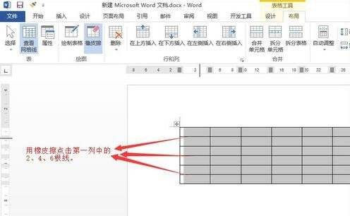 这时我们选中表格之后,在工具栏中会出现【表格工具】,点击表格工具下面的“布局”,这时在工具栏第二行中会出现橡皮擦,点击橡皮擦。