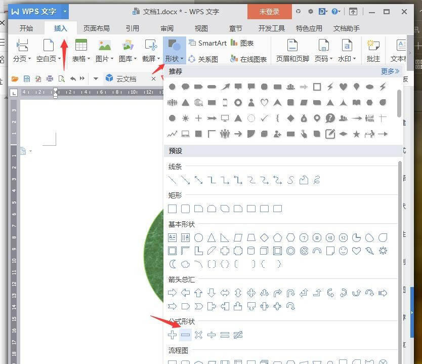 1、新建WPS文档,点击【插入】【形状】【半圆弧】。