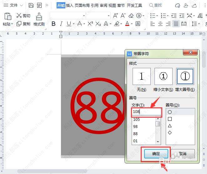 修改文字,把圈号的文字中修改为自己喜欢的数字,比如:108,点击【确定】。