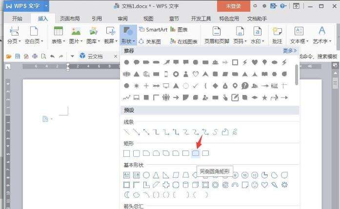 1、新建WPS文档,点击【插入】【形状】【同侧圆角矩形】。