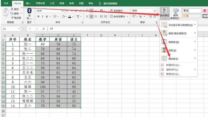 2、选中成绩,点击开始-条件格式-图标集,