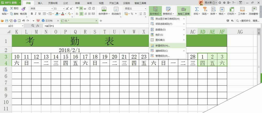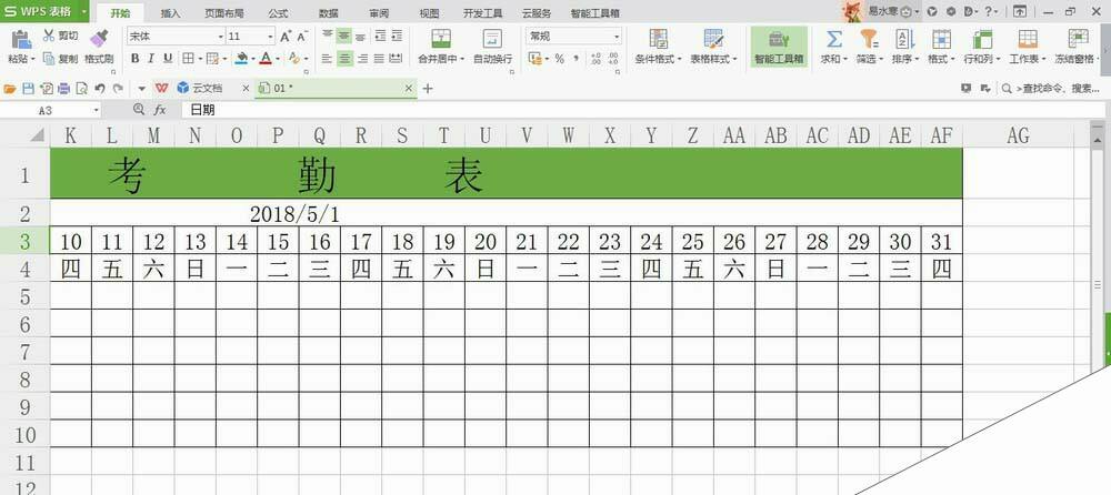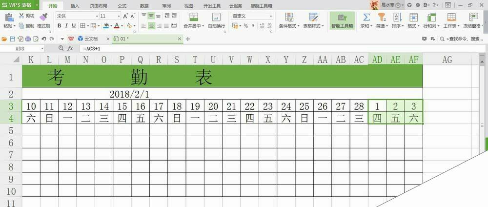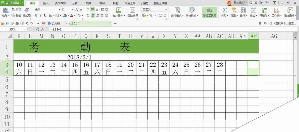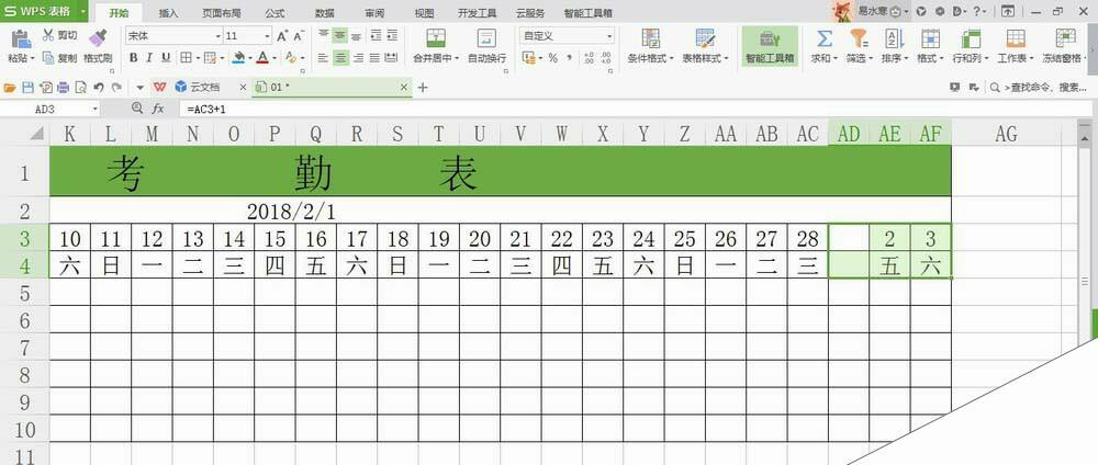 打开WPS表格,新建一个考勤表,可以看到2月份的表格后三个单元格为3月份的日期;